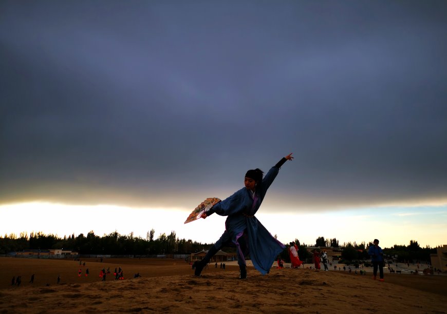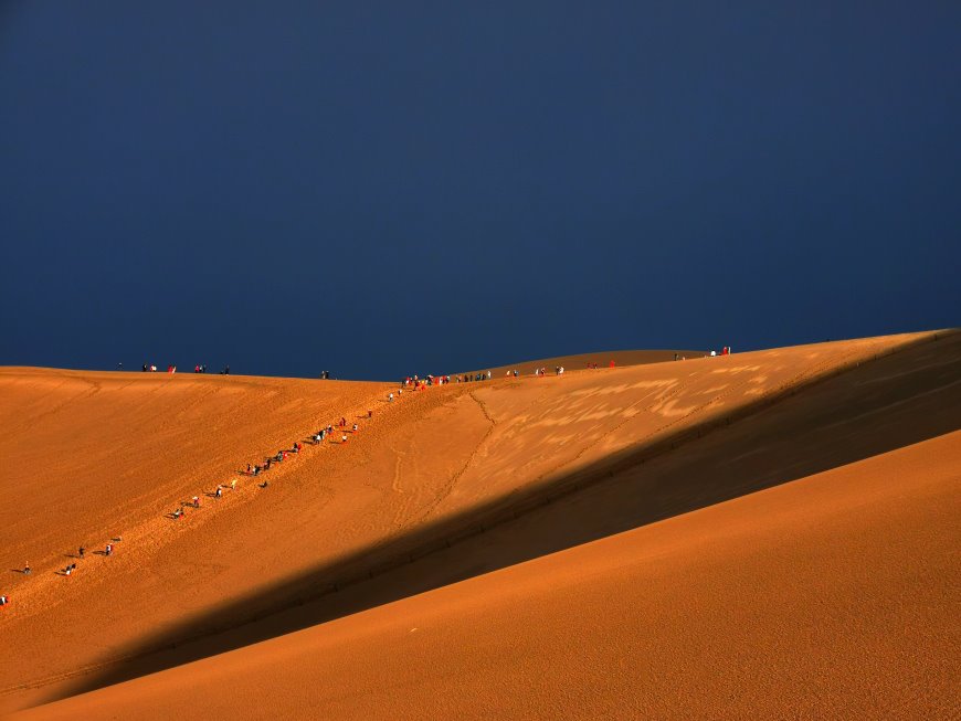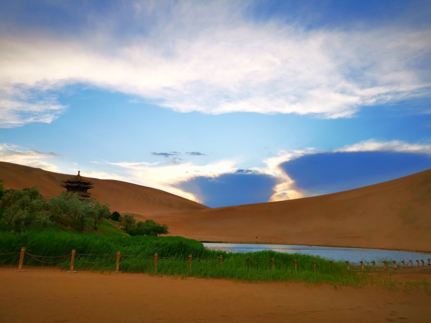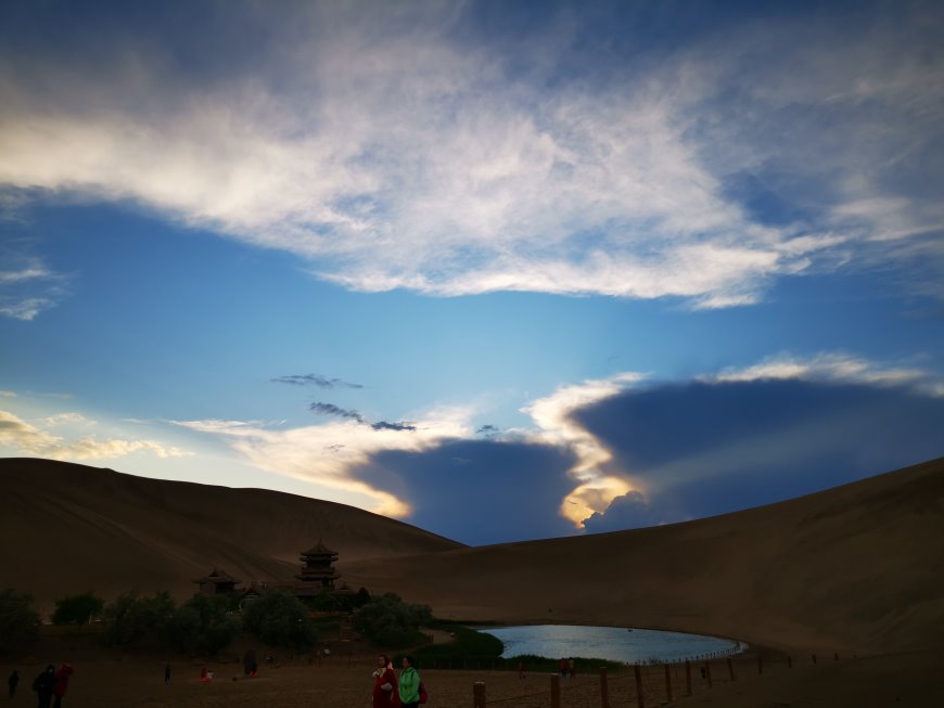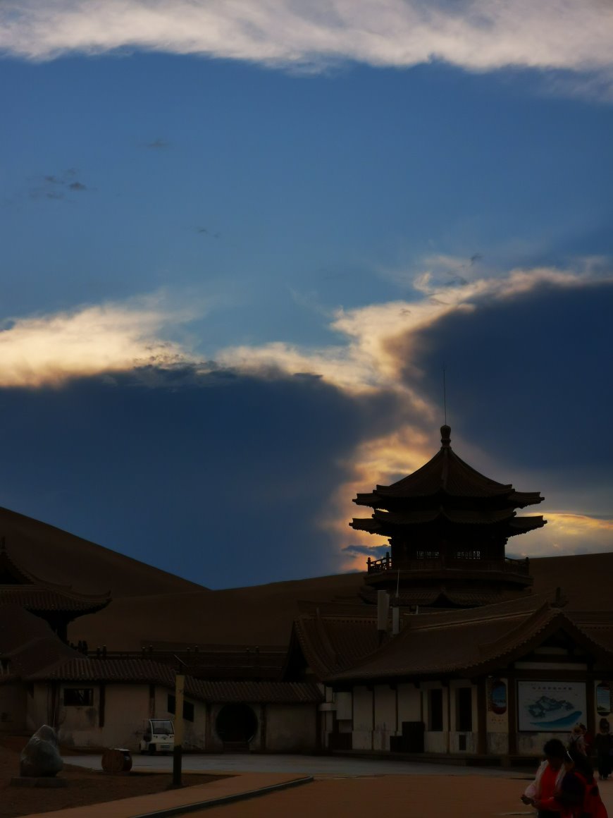 离开张掖七彩丹霞,直奔500多公里外的敦煌,一路大雨断断续续。 晚饭品尝了戈壁滩特有的野菜沙葱,沙葱一般是雨后第二天露出芽,一两天长成,如果没有及时采摘,就干枯而死,非常难得! 饭后进了鸣沙山景区,暴雨之后仍旧乌云满天,鸣沙山湿漉漉的,黯然失色,凭着直觉,稍等会有阳光,不出所料,临近景区关门时,太阳出来了,沙漠异彩纷呈,金色的鸣沙山美不胜收!不到几分钟,乌云又遮住了太阳,月牙泉夕照没能拍成,有点遗憾!