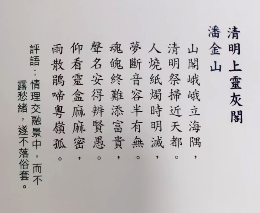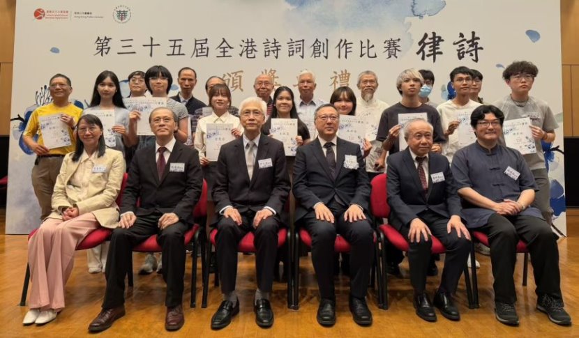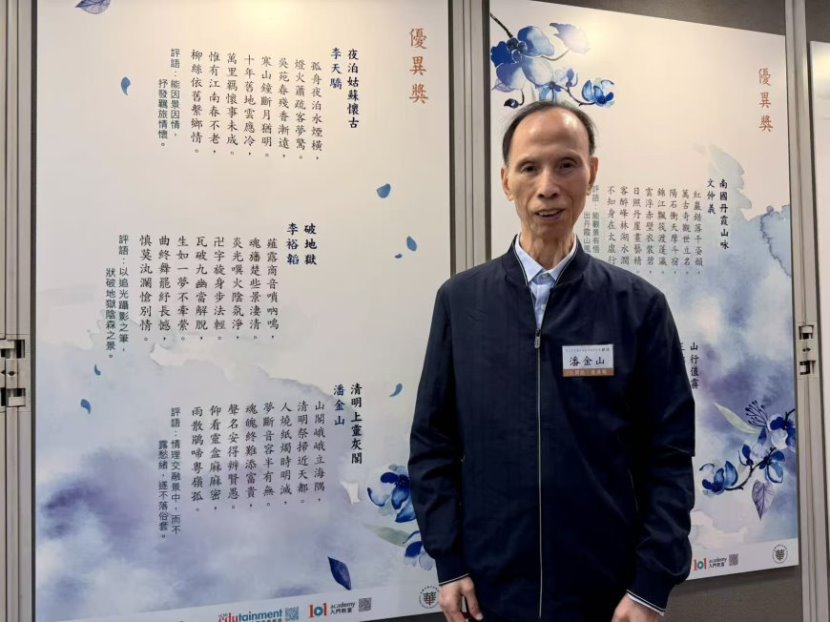 潘金山校友荣获 香港第35届(2025)诗词比赛(律诗)于2025年9月25日在中央图书馆演讲厅颁奖,潘金山校友获公开组优异奖(第四名至第八名统称优异奖,奖金$3000),获奖作品如下: 《清明上靈灰閣》 山閣峨峨立海隅, 评判团对此作品的评语是:“情理交融景中,而不露愁绪,遂不落俗套”。 比赛是由香港政府康文署中央图书馆举办的,每年举办一届,单年比诗(五、七律,指定韵部),双年比词(指定词牌) ,今年比赛律诗。 康文署邀请以下著名中文教授、诗论家组成评判团: 比赛的程序是:作品隐名编号,电脑随机分组,评委初评,集体复评,投票表决,开会颁奖,政府刊网。本届参赛作品有八百多份,公开组评出十篇作品授奖。 评奖过程受香港廉政公署监管。 评选过程严谨,对作品要求:必须是原创的,不准有抄袭成份 ,也不准事先发表过,内容要有特色,格式要符合传统,既要含蓄,又不能加注解;对每句、每字都要反复推敲,不能有任何败笔。 由于香港人讲的广州话很接近平水韵,加之历史上经济上及文化教育上的原因,这给港人诗词创作带来很大的方便,因此每年的全港诗词创作比赛都是高手林立,佳作纷呈。 潘金山校友参赛多届,前后六届获奖。他是学工科,搞工程出身的,因而常被诗友称为诗人工程师。 颁奖典礼在香港中央图书馆演讲厅举行,出席典礼的人士有:主礼嘉宾香港政府康文署助理署长李子俊先生,中央图书馆副馆长,全体评判团成员,获奖作者。