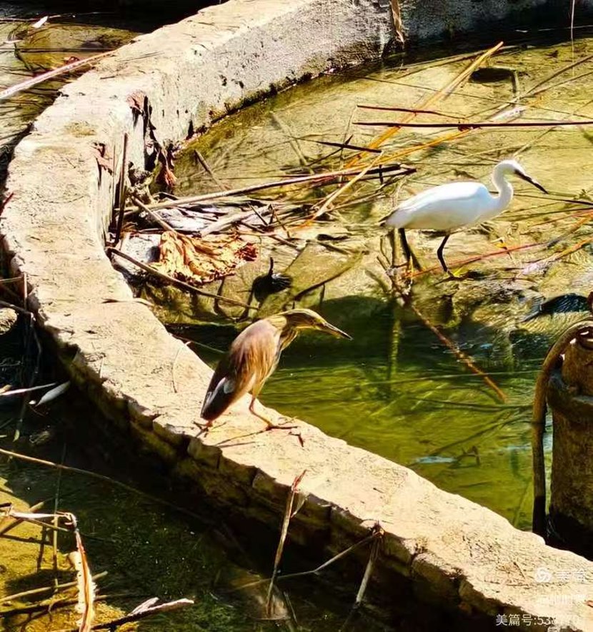 在荷池浅滩中觅食的鹭鸟,为冬景增添灵动生机。
