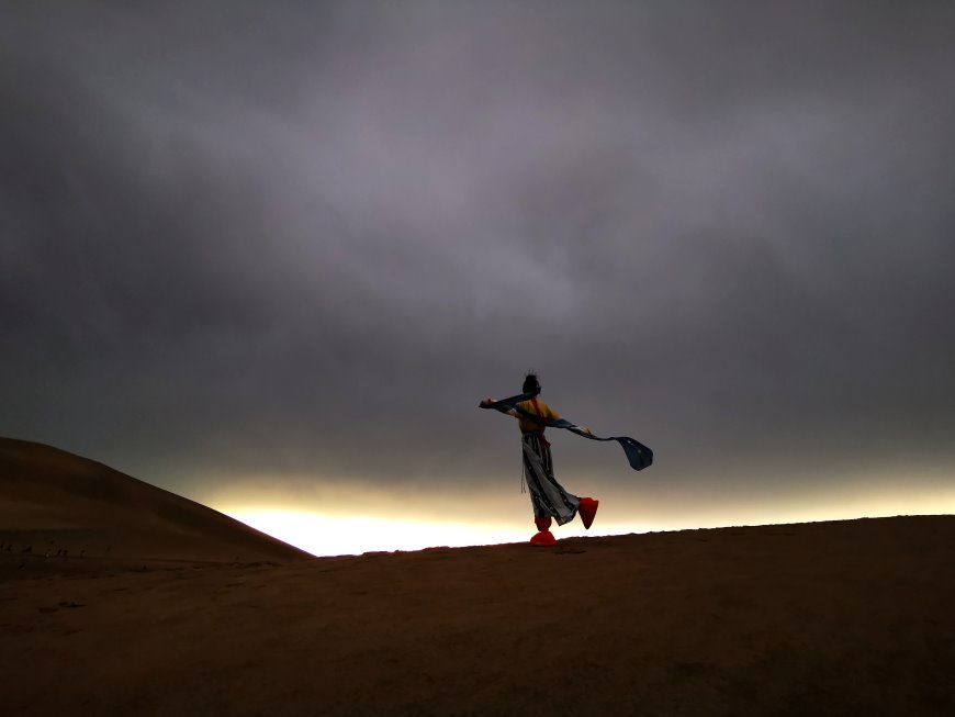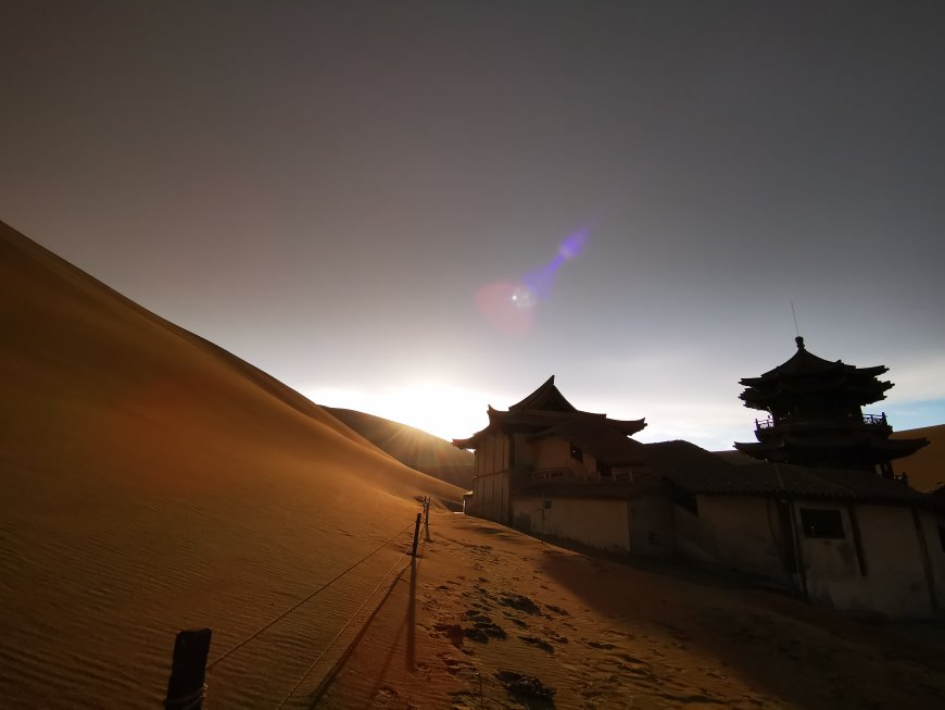 离开张掖七彩丹霞,直奔500多公里外的敦煌,一路大雨断断续续。 晚饭品尝了戈壁滩特有的野菜沙葱,沙葱一般是雨后第二天露出芽,一两天长成,如果没有及时采摘,就干枯而死,非常难得! 饭后进了鸣沙山景区,暴雨之后仍旧乌云满天,鸣沙山湿漉漉的,黯然失色,凭着直觉,稍等会有阳光,不出所料,临近景区关门时,太阳出来了,沙漠异彩纷呈,金色的鸣沙山美不胜收!不到几分钟,乌云又遮住了太阳,月牙泉夕照没能拍成,有点遗憾!
