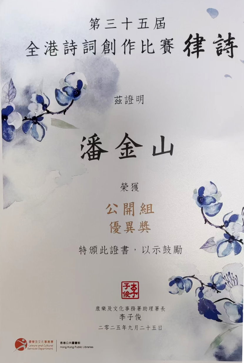 潘金山校友荣获 香港第35届(2025)诗词比赛(律诗)于2025年9月25日在中央图书馆演讲厅颁奖,潘金山校友获公开组优异奖(第四名至第八名统称优异奖,奖金$3000),获奖作品如下: 《清明上靈灰閣》 山閣峨峨立海隅, 评判团对此作品的评语是:“情理交融景中,而不露愁绪,遂不落俗套”。 比赛是由香港政府康文署中央图书馆举办的,每年举办一届,单年比诗(五、七律,指定韵部),双年比词(指定词牌) ,今年比赛律诗。 康文署邀请以下著名中文教授、诗论家组成评判团: 比赛的程序是:作品隐名编号,电脑随机分组,评委初评,集体复评,投票表决,开会颁奖,政府刊网。本届参赛作品有八百多份,公开组评出十篇作品授奖。 评奖过程受香港廉政公署监管。 评选过程严谨,对作品要求:必须是原创的,不准有抄袭成份 ,也不准事先发表过,内容要有特色,格式要符合传统,既要含蓄,又不能加注解;对每句、每字都要反复推敲,不能有任何败笔。 由于香港人讲的广州话很接近平水韵,加之历史上经济上及文化教育上的原因,这给港人诗词创作带来很大的方便,因此每年的全港诗词创作比赛都是高手林立,佳作纷呈。 潘金山校友参赛多届,前后六届获奖。他是学工科,搞工程出身的,因而常被诗友称为诗人工程师。 颁奖典礼在香港中央图书馆演讲厅举行,出席典礼的人士有:主礼嘉宾香港政府康文署助理署长李子俊先生,中央图书馆副馆长,全体评判团成员,获奖作者。