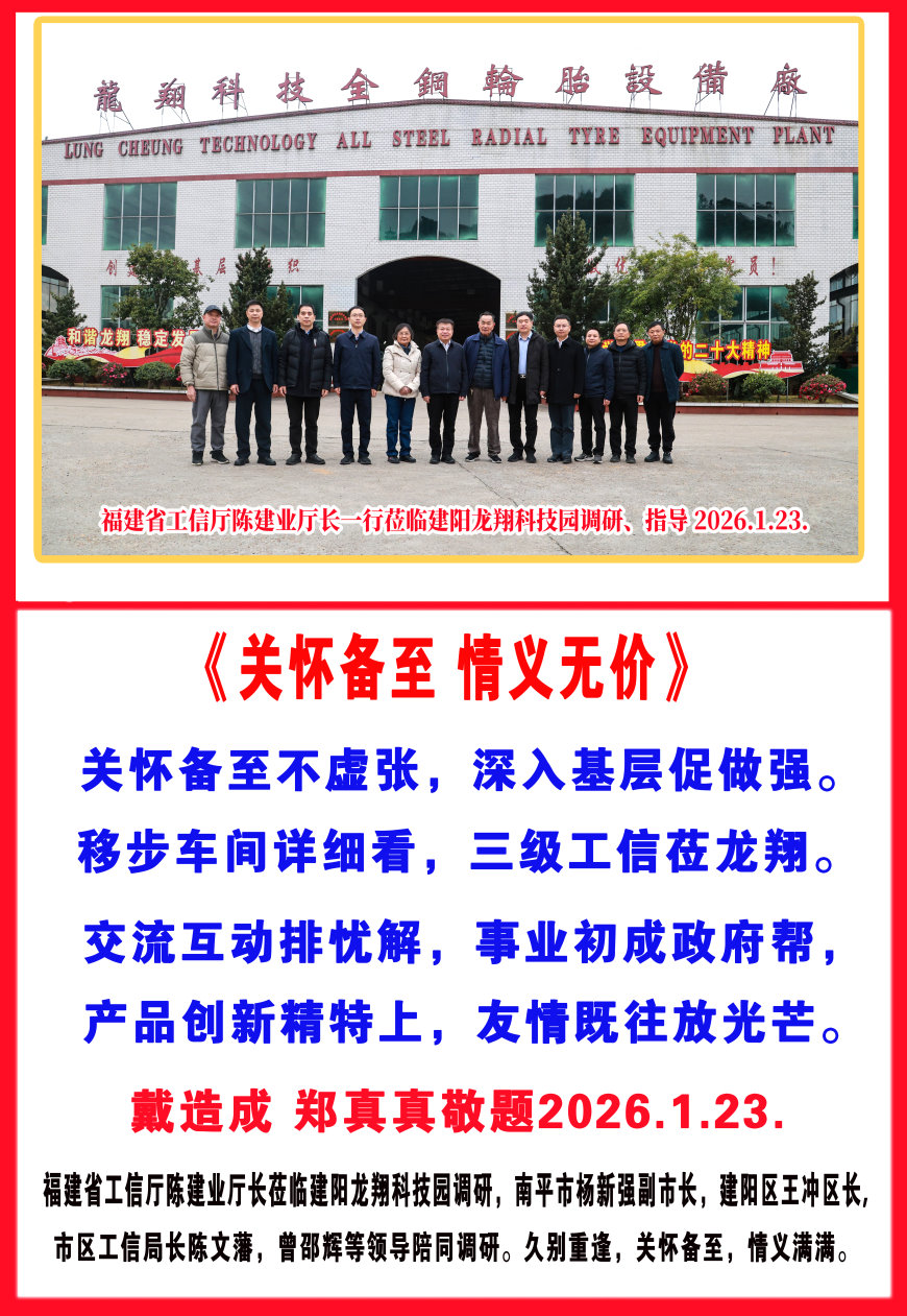 福建省工信厅陈建业厅长暨杨鹏飞主任,郭城处长到莅临建阳龙翔科技园调研,南平市杨新强副市长,建阳区王冲区长,张华常委副区长,南平市工信局陈文藩局长,陈金桥局长等领导陪同调研。2026.1.23.
