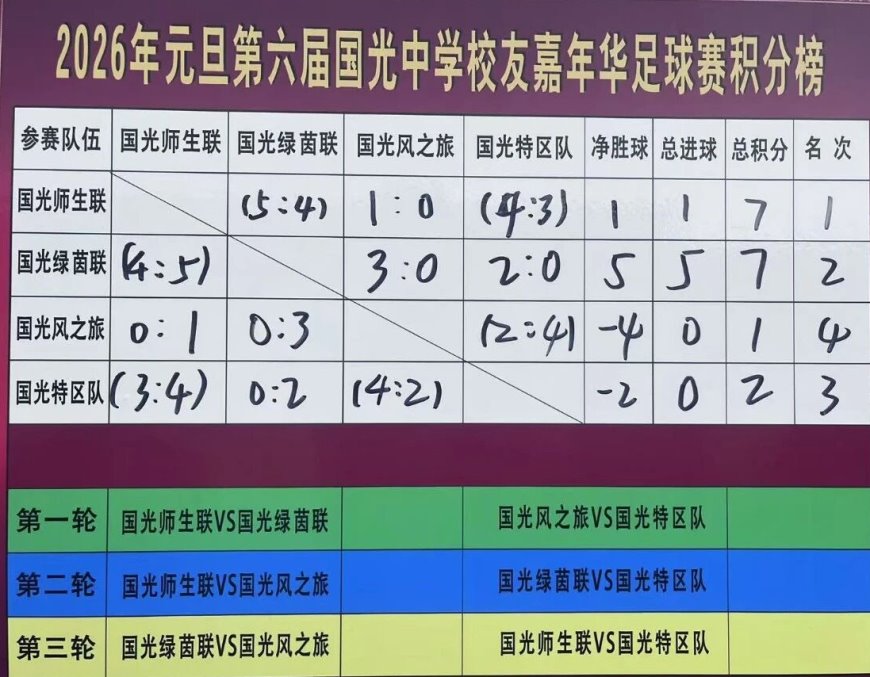 第六届国光校友足球元旦嘉年华圆满落幕,师生联队勇夺桂冠! 戴炳煌 (南安) 高中98届 2026年1月1日,第六届国光校友足球元旦嘉年华在母校足球场激情上演。四支代表队经过激烈而友好的角逐,最终国光师生联队凭借出色表现夺得冠军,国光绿茵联队以微弱差距屈居亚军,国光特区联队获得季军,而由老学长组成的国光风之旅则荣获优秀奖。 赛事精彩瞬间 当天下午13:00,比赛正式拉开帷幕。绿茵场上,校友们奔跑的身影仿佛让时光倒流,回到了那个纯真的学生时代。年轻校友凭借体力和速度不断冲击,年长校友则依靠经验和配合沉着应对,每一次精彩的传球、抢断和射门都引来场边阵阵喝彩。 比赛中,师生联队展现出了良好的团队配合,而绿茵联队虽然三战两胜,却在点球大战中惜败,最终屈居亚军。特区联队的球员们虽然从外地归来,但他们的热情丝毫不减。最令人感动的是风之旅的老学长们,他们用实际行动诠释了什么是“永不言败”的体育精神。 传承与希望 本届嘉年华最令人欣慰的是,足球的希望正寄托在少年们身上。师生联队的夺冠,预示着国光足球精神的代代相传。正如其他校友赛事所体现的,这种新老学子间的交流与传承,正是校友赛事最珍贵的价值所在。 老学长们虽然体力不如年轻人,但他们的技术和意识仍然令人赞叹。他们用实际行动证明,足球不仅是年轻人的运动,更是一份可以终身热爱的事业。 温馨的赛后聚会 比赛结束后,参赛球员们齐聚餐厅,继续延续着这场校友情谊的盛宴。聚餐期间,欢声笑语不绝于耳,校友们互相交流着比赛心得和生活近况,仿佛又回到了学生时代。 最令人难忘的是合影时刻,当所有校友站在一起,脸上洋溢着快乐的笑容时,餐厅里的其他顾客纷纷投来羡慕的目光。这一刻,我们深切地感受到,国光校友之间的情谊是如此深厚而珍贵。 感恩与致谢 本次活动的圆满成功,离不开组委会成员的辛勤付出和幕后支持的校友们。从活动策划到现场组织,从赛程安排到后勤保障,每一个环节都凝聚着他们的心血和汗水。 值得一提的是,虽然筹备时间短暂,但组委会有条不紊的工作确保了赛事顺利进行。他们用实际行动诠释了“公毅立队、光前裕后、和衷共济、怡然自得”的国光校友队精神。 同时,我们也要感谢母校的大力支持,为校友们提供了这个重温青春、再叙情谊的平台。正如其他学校校友活动一样,母校永远是校友们最坚实的后盾和最温暖的家园。 展望未来 第六届元旦嘉年华虽然落幕,但国光校友的情谊永远不会散场。本次活动的成功举办,不仅加深了校友之间的联系,也为未来的校友活动奠定了良好的基础。 让我们共同期待新春嘉年华的再次相聚,继续在绿茵场上挥洒汗水,延续这份珍贵的校友情谊。相信在校友的共同努力下,国光校友足球队的明天会更加美好! 归来仍是少年,情谊永驻心间。期待下一次绿茵相聚! 2026年1月2日